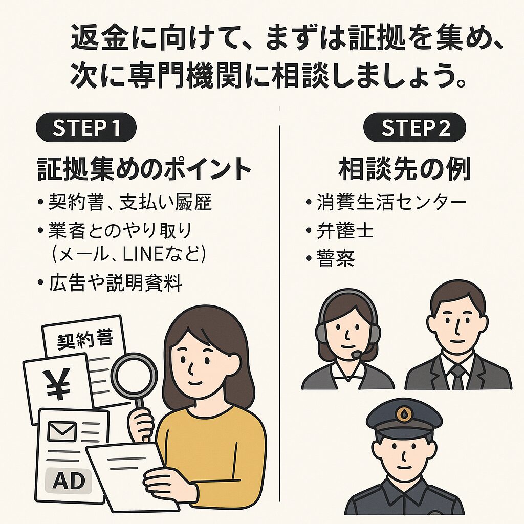 - 返金に向けて行動を検討する際に、まず何をすべきか、一般的な手順(証拠集め、相談先の検討など)を把握できます。
