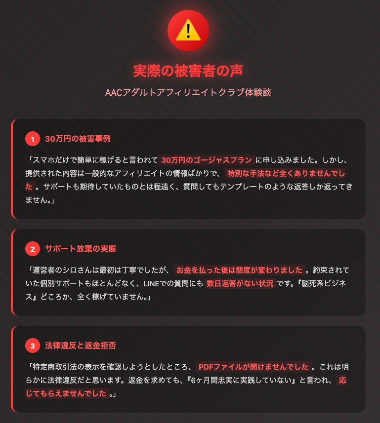 これらのケースにも見られるように、AACアダルトアフィリエイトクラブに限らず、「副業詐欺」と疑われる手口には、警戒すべき共通のパターンが存在します。あなたの経験がこれらに当てはまるか、確認してみてください。