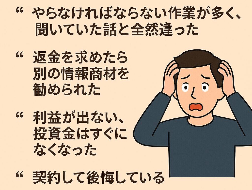 • 「誰でも」「簡単に」「高額が稼げる」といった甘い言葉で誘う。